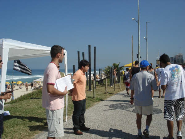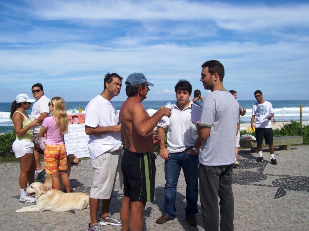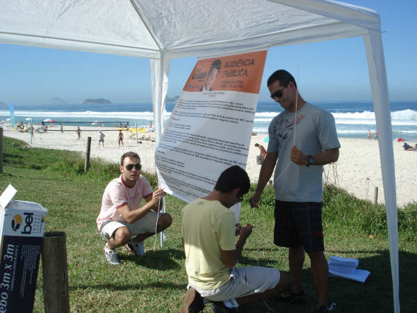| Dessa forma, nos dias 17 e 23 de maio, integrantes do gabinete do vereador realizaram atividades de divulgação do projeto de lei, na praia da Barra, com a presença de Caiado. No primeiro dia, o grupo instalou-se nas proximidades do Condomínio Atlântico Sul, e, no segundo, montaram a barraca perto do Condomínio Barrabela. | ||