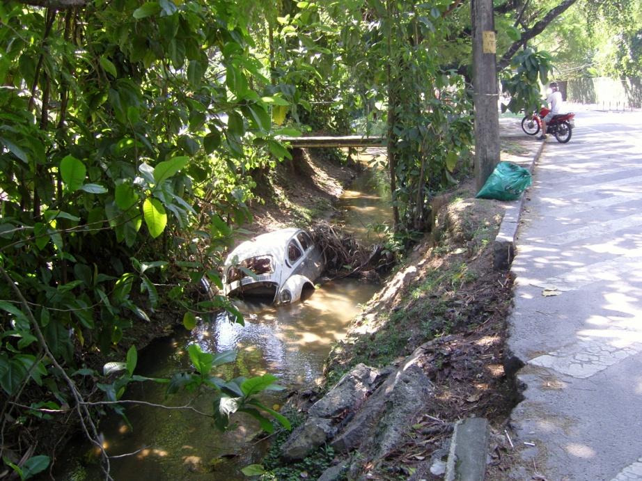 Na foto abaixo, é possível observar diversas irregularidades: além do Fusca, a calçada está caindo em direção ao rio e um saco de lixo da Comlurb também foi deixado à beira do curso d´água, para onde pode ser arrastado logo na primeira chuva. O vereador Carlo Caiado, presidente da Comissão Especial de Saneamento da Zona Oeste, encaminhou um ofício à Secretaria Municipal de Conservação e Serviços Públicos – Seconserva solicitando providências e o veículo já foi retirado. |
