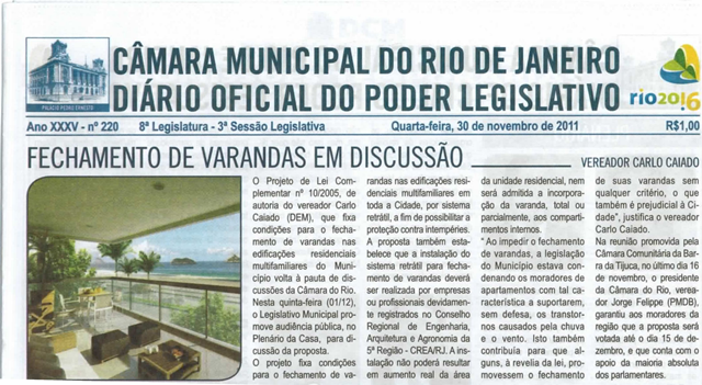 Um dos grandes pedidos dos moradores de diversos pontos da cidade, em especial da Barra, é quanto à regularização do fechamento de varandas. O Projeto de Lei 10A, de autoria de Carlo Caiado, tramita na Câmara desde 2005 com este objetivo, permitindo o fechamento por dispositivo retrátil, para proteção contra chuva e vento, sem que haja acréscimo na área do apartamento. |