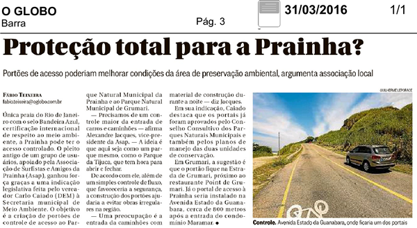 | Preservação ambiental: Caiado solicita à Prefeitura Portais de Controle de Acesso aos parques da Prainha e Grumari | ||